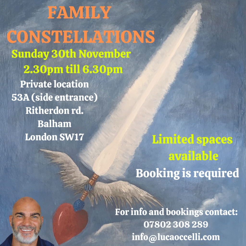 For the participants that wish to constellate but cannot because of time restriction I offer the opportunity to do a personal constellation in person or via Zoom at the reduced price of £60 instead of £100.